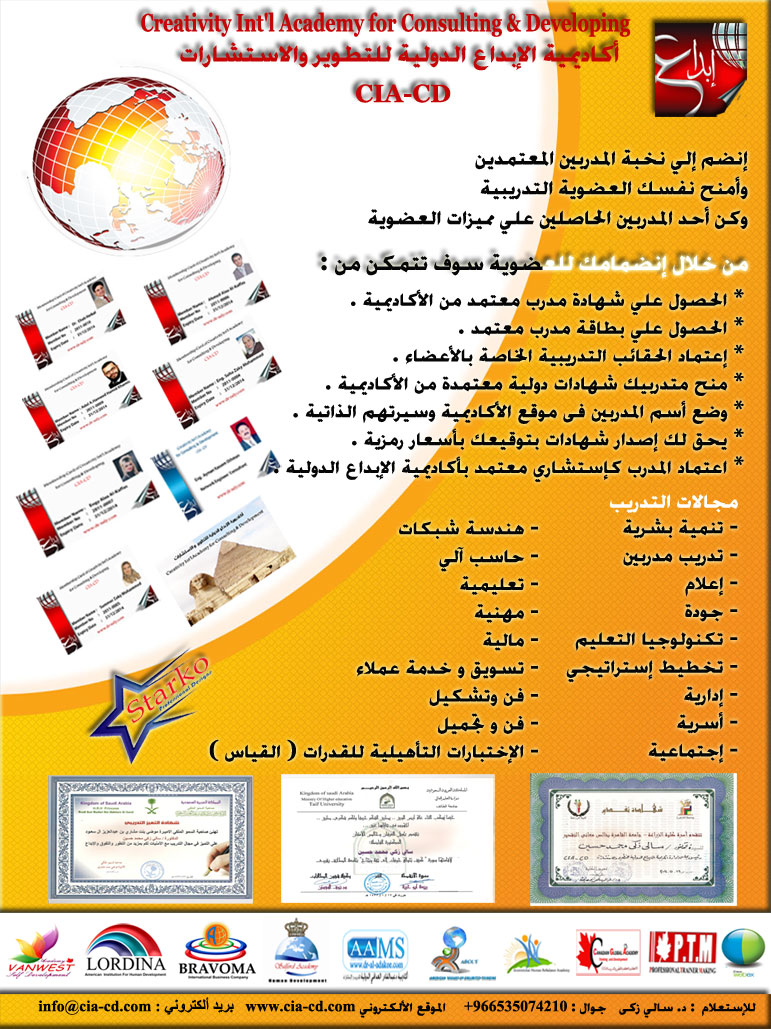 تعلن الإبداع الدولية للتطوير والاستشارات عن ترحيبها بإنضمام مستشاريين جدد ( أفراد و مراكز و مؤسسات تدريبية و الجامعات ) ترغب فى إعتماد دوراتها أو حقائبها التدريبية أو مدربيها لدي الإبداع الدولية وذلك بتقديم طلب رسمي علي الأوراق الخاصة بها وإرساله إلى الإدارة عبر البريد الالكتروني المدرج أدناه .. حتى يتسني لإدارة الإبداع الدولية مراجعة الأوراق المرفقة وإعتمادهم لديها